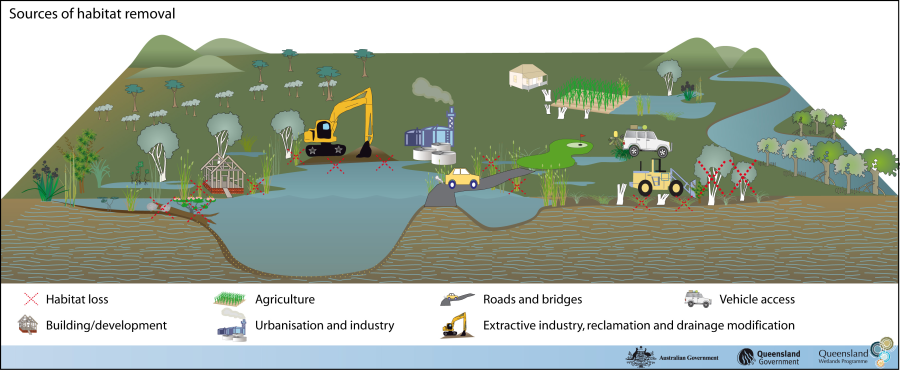 Last updated: 22 March 2013 This page should be cited as: Department of Environment, Science and Innovation, Queensland (2013) Habitat removal – Pressures, WetlandInfo website, accessed 8 May 2025. Available at: https://wetlandinfo.des.qld.gov.au/wetlands/management/pressures/lacustrine-palustrine-threats/habitat-removal/pressure.html |