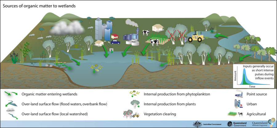 Organic matter enters wetlands from diffuse catchment via local overland surface flow, in floodwaters (overbank flow) or directly from urban and agricultural land use or point sources.