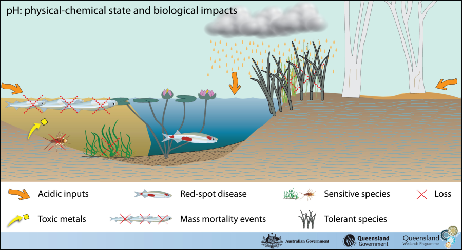 The rapid release of acid into a wetland following rain events can reduce pH levels of the soil and water leading to disease, e.g. red-spot in fish, mass mortality events, loss of sensitive biota and the leaching of toxic metals. Acid tolerant species can dominate and prevent original plant species from re-establishing or the soil can become so acid it can prevent the growth of any plant species.