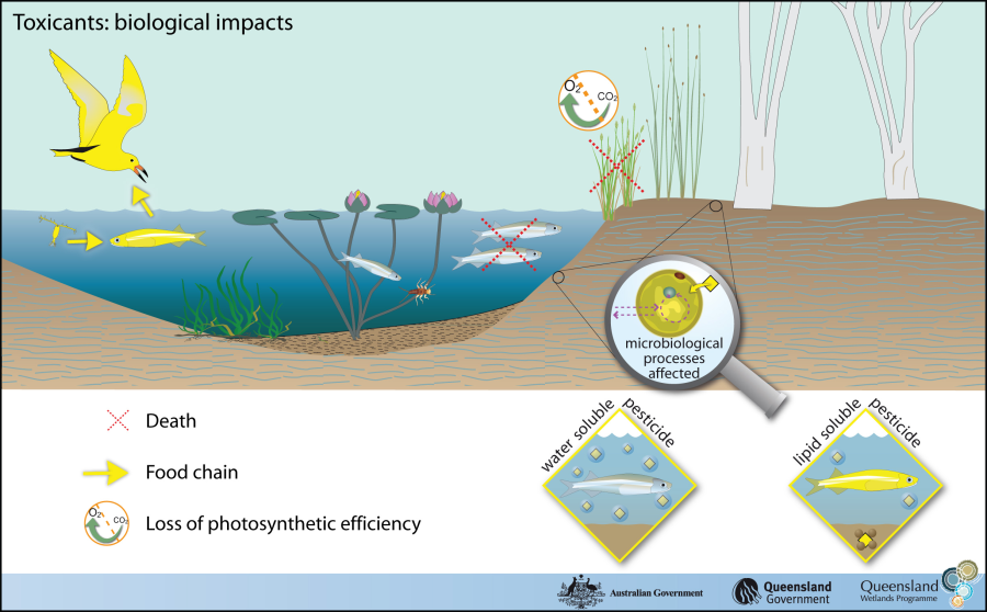 Animals and/or plants that are sensitive to toxicants may die if exposed to them, often in mass events. Pesticides and heavy metals can be assimilated by biota and move through the food chain. Herbicide settlement on plants can affect photosynthetic efficiency and may lead to the death of the plant.