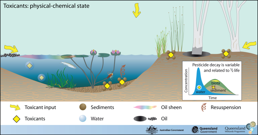 Pesticides and heavy metals are transported attached to sediments or dissolved in the water. Resuspension of sediments through natural or anthropogenic processes can allow toxicants to become available again. Pesticides and heavy metals are deposited with fine mud sediments. Oil is partially water insoluble and can make its way into soils.