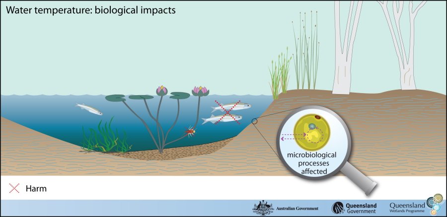 Water temperature has a direct physiological effect on biota (e.g. affecting basic processes such as growth, mobility, reproduction, photosynthesis and respiration). However, biota have upper and lower tolerable limits. Some species are more susceptible to these limits than others. Susceptible species abundance will decrease while tolerant species may increase (e.g. algal blooms) altering the community structure. Mass mortality may also occur due to anoxic/hypoxic related events.