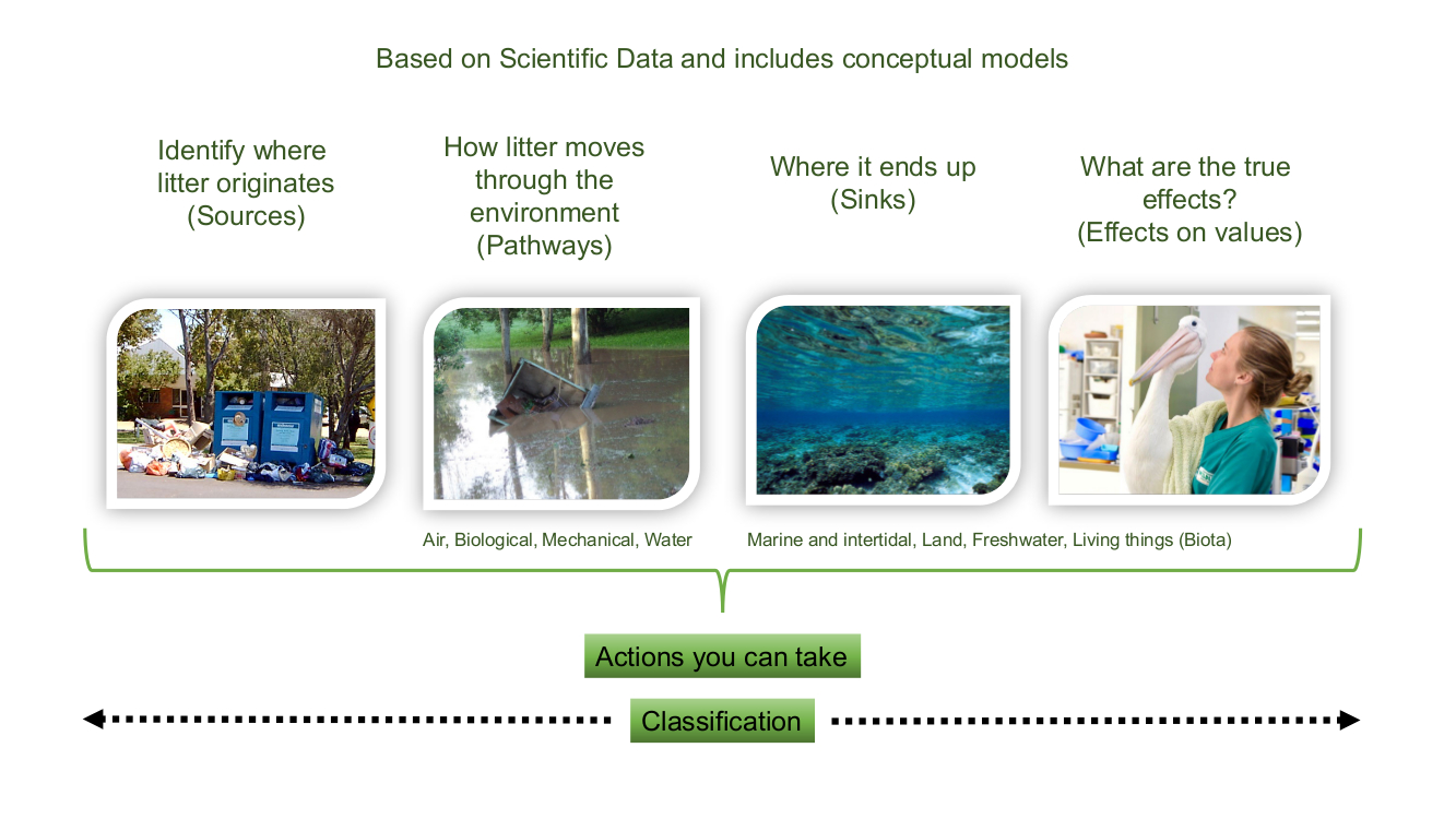 Successful change involves consultation and cooperation with all parties involved. Consultation can identify opportunities, assist decision making and help ensure any new ideas work effectively in practice. Extensive consultation for the Litter and Illegal Dumping Management Framework (LIDMF) project was undertaken. An advisory group was formed to oversee the LIDMF and the development of attribute-based classification scheme. The advisory group ensured the materials developed were to provide governance, coordination and support strategic direction. At the centre of the LIDMF is an attribute-based classification scheme that examines waste in its component parts. This allows littered and illegally dumped waste to be described in its original form (for example, a plastic bottle) but also allows the waste to be tracked as it moves through the environment and impacts certain places (for example, as it breaks up into microplastic and contaminates soil). This ensures that waste data and management actions are objective and complete. The LIDMF is a holistic biophysical management framework that examines the many sources of waste pollution, the pathways that move waste through the environment and the effects of waste on human health, animals and the environment. It should be noted that the LIDMF records all waste movement entering and moving through the environment. This includes wastes that are both legally and illegally deposited, and which may become waste pollution though a range of processes. The LIDMF does not imply that all wastes and activities listed in this framework are from illegal activities.