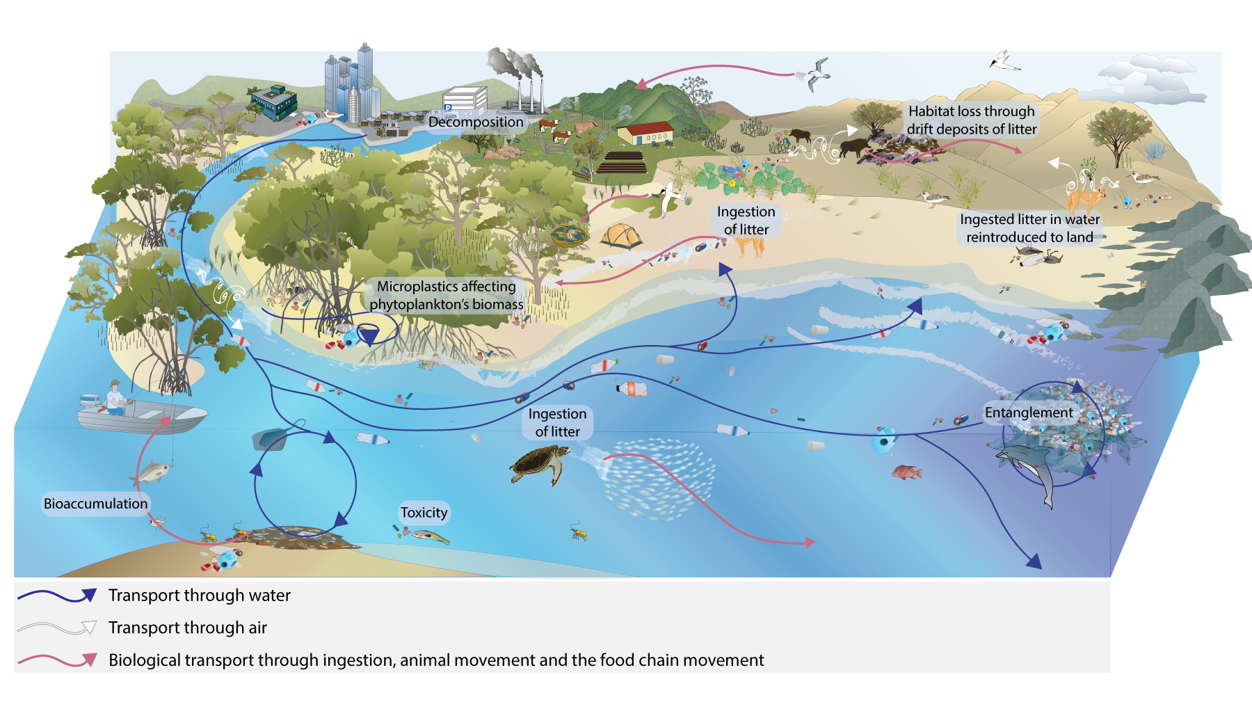 Living things (biota)Living things (biota) Living things (biota)When living things ingest waste material, they can become a waste sink. Many studies have focused on the impact of plastic and other waste on living things. However, the probability and extent of waste ingested by living things is not well understood. Research by Grant et al (2021) has found that seabirds are a transfer mechanism for marine-derived plastics. They ingest at sea and reintroduce items back into the terrestrial environment, thus making seabird colonies a sink for plastic debris[2]. One study team has suggested that 100,000 tonnes of plastic, including nanoplastics, could be inside animals at any point in time[4]. The nature of micro- and nanoplastics and their harmful consequences has drawn significant attention in recent years in the context of environmental protection. A review paper released in February 2021 investigated this evolving subject, focusing on the documented human health and marine environment impacts of micro- and nanoplastics and including a discussion of the economic challenges and strategies to mitigate this waste problem[1]. Seabirds were found to be a transfer mechanism for marine-derived plastics. They ingest at sea and reintroduce items back into the terrestrial environment, thus making seabird colonies a sink for plastic debris[2]. Oysters are a good reference species for investigations into microplastics, given the fact that they filter-feed, and can be a good indicator of the presence of environmental contamination. A review of global literature showed that around 94% of oysters had microplastic contamination. Wild-caught oysters also had higher contamination than aquaculture raised specimens (more than double the contamination), possibly due to cleaner waters in aquaculture farms[5]. A study found that microplastics affected the biomass of phytoplankton species. The impact varied depending on location and season, and some species had greater tolerance to the chemicals[3]. The extent and impact of plastics ingested by living things requires further study. References