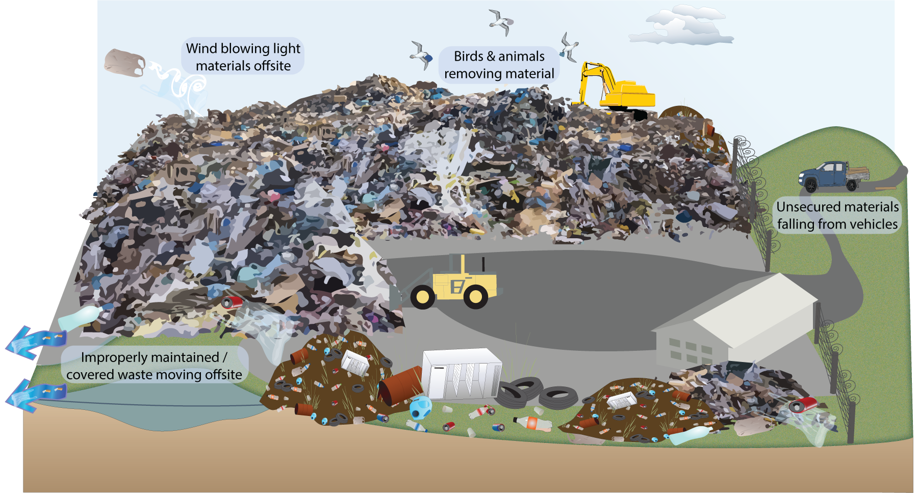 Click on elements of the model or select from the tabs below Litter that has moved outside landfill sites can impact the environment. This waste pollution may result from:
