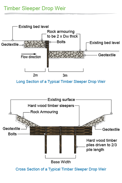 - Rock armouring is an important design element of any timber sleeper drop weir arrangement. The failure to incorporate rock armouring potentially risks long term physical damage to the surrounding river and potential damage to, and/or failure of the timber sleeper drop weir.