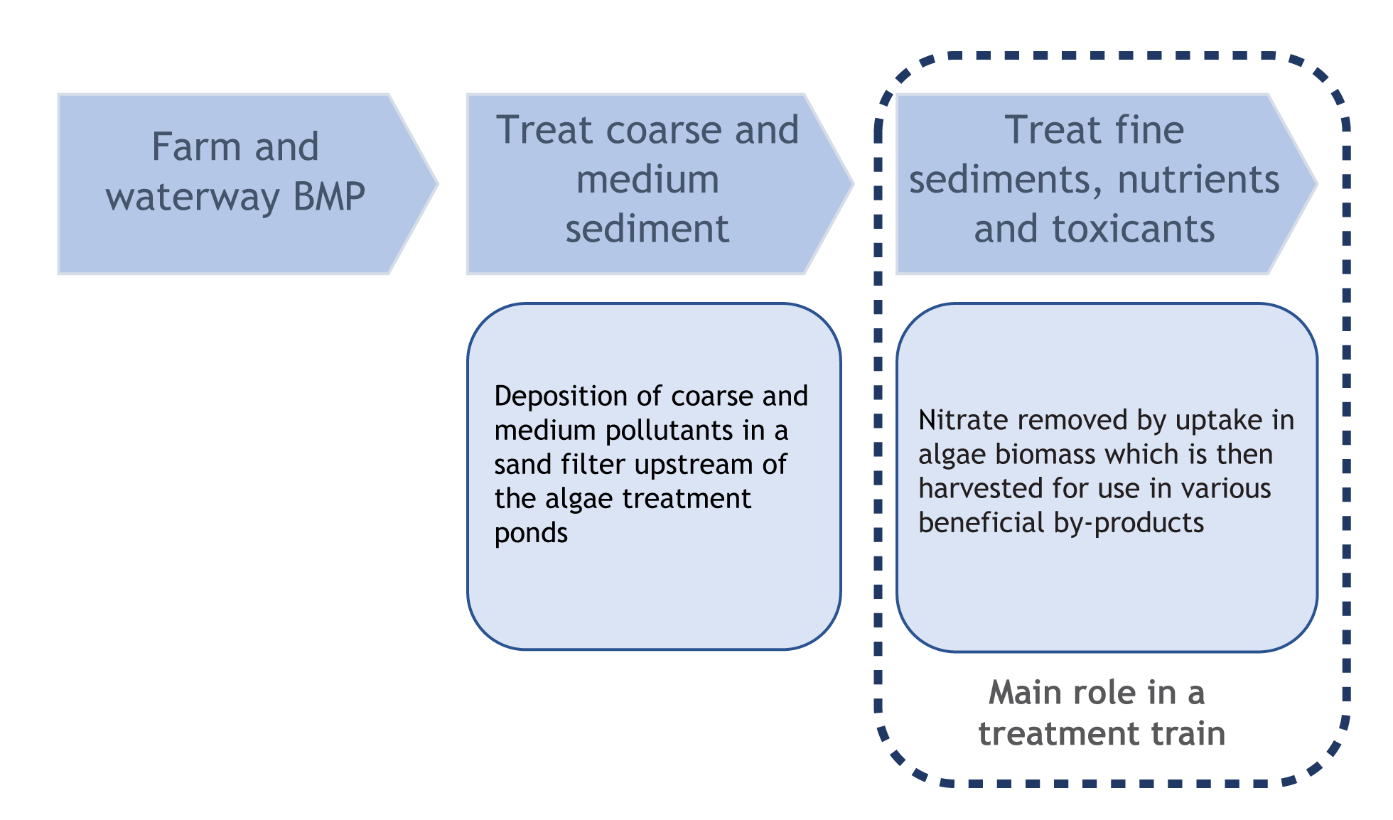 Suitability and limitationsThe technology has been applied to aquaculture, sewage treatment plants and industrial waste streams[2][6]. Different macroalgae species can be selected for treating freshwater or saline water, so it is particularly relevant to land-based marine aquaculture. The treatment system may be applicable to agricultural stormwater runoff or irrigation tailwater where regular flows are available and the system is appropriately designed with a high flow bypass for storm flows[5][2]. The capacity of macroalgae to treat irrigation tailwater from sugar cane has been trialled in a laboratory. This included testing the effects of added diuron (photosystem II inhibiting herbicide used in sugarcane production) as might be present in sugarcane runoff/tailwater to test whether the macroalgae treatment systems could effectively operate in the presence of this herbicide. The algae trialled (Oedogonium sp.) survived, with reduced productivity, when diuron concentrations were 10µg/L, however diuron concentrations of 30μg/L were lethal[3]. The cost-effectiveness of algae treatment in removing the target pollutant/s needs to be considered relative to other treatment structures. Refer to cost considerations for more information. DisclaimerIn addition to the standard disclaimer located at the bottom of the page, please note the content presented is based on published knowledge of treatment systems. Many of the treatment systems described have not been trialled in different regions or land uses in Queensland. The information will be updated as new trials are conducted and monitored. If you have any additional information on treatment systems or suggestions for additional technologies please contact us using the feedback link at the bottom of this page. References