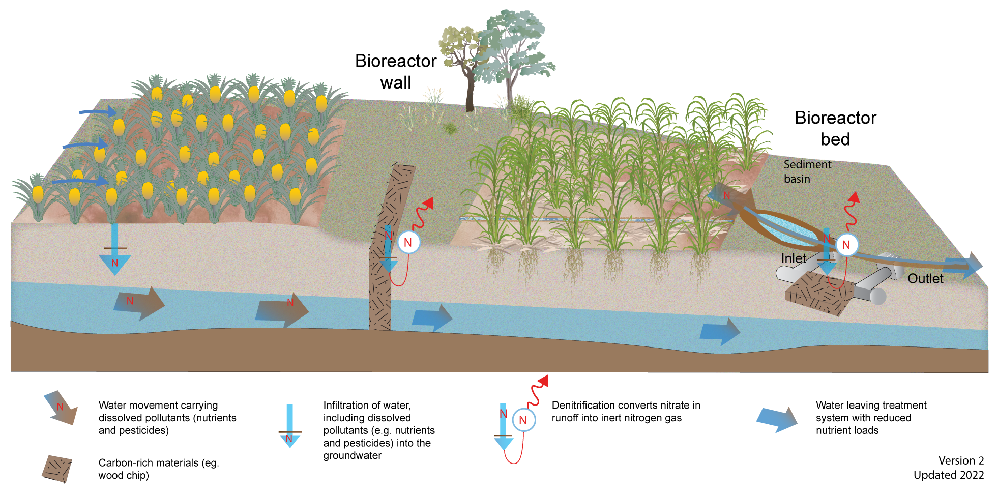 Case study: bioreactor bed on a cane farm near Ayr. DisclaimerIn addition to the standard disclaimer located at the bottom of the page, please note the content presented is based on published knowledge of treatment systems. Many of the treatment systems described have not been trialled in different regions or land uses in Queensland. The information will be updated as new trials are conducted and monitored. If you have any additional information on treatment systems or suggestions for additional technologies please contact us using the feedback link at the bottom of this page. References