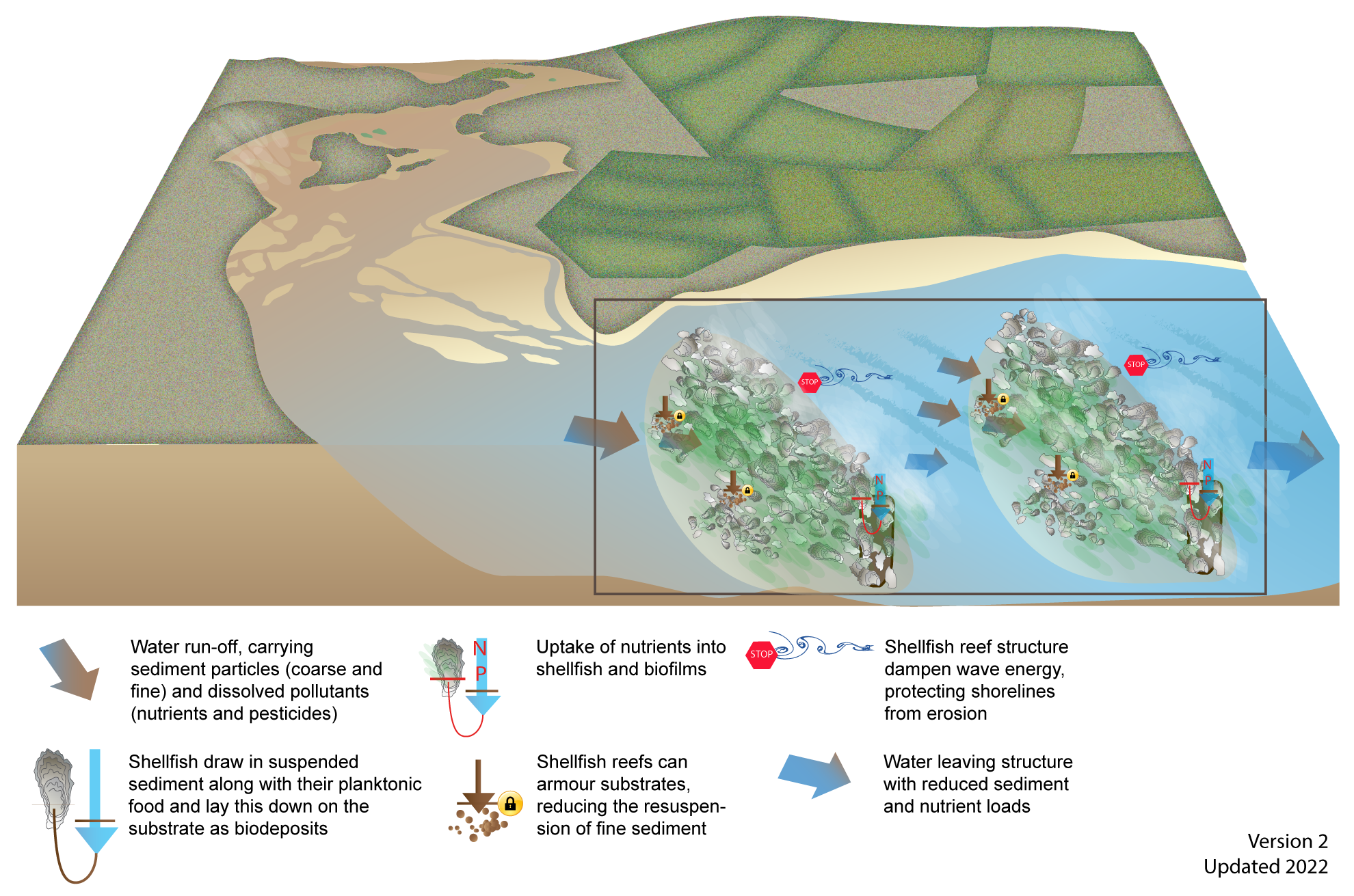 The filtration of suspended matter in the water column by shellfish can cause a reduction in turbidity, improving light penetration and growing conditions for submerged vegetation, whilst the consumption of phytoplankton releases ammonium as a waste product supporting aquatic vegetation growth.