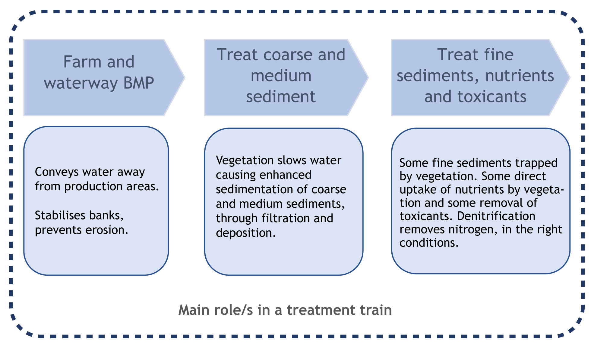Suitability and limitationsVegetated drains are suitable in almost all agricultural and aquaculture production systems and climates. Drains are common throughout farms in Queensland, providing opportunities to improve water quality by modifying and managing drains to encourage and retain vegetation. Residence time will influence the effectiveness of vegetated drains in removing nutrients and toxicants. Therefore, vegetated drains will be more effective if water flow is relatively slow, maximising the time water is in contact with vegetation. Vegetated drains with extended residence times act as linear wetlands, promoting nutrient and toxicant removal[1]. DisclaimerIn addition to the standard disclaimer located at the bottom of the page, please note the content presented is based on published knowledge of treatment systems. Many of the treatment systems described have not been trialled in different regions or land uses in Queensland. The information will be updated as new trials are conducted and monitored. If you have any additional information on treatment systems or suggestions for additional technologies please contact us using the feedback link at the bottom of this page. References
