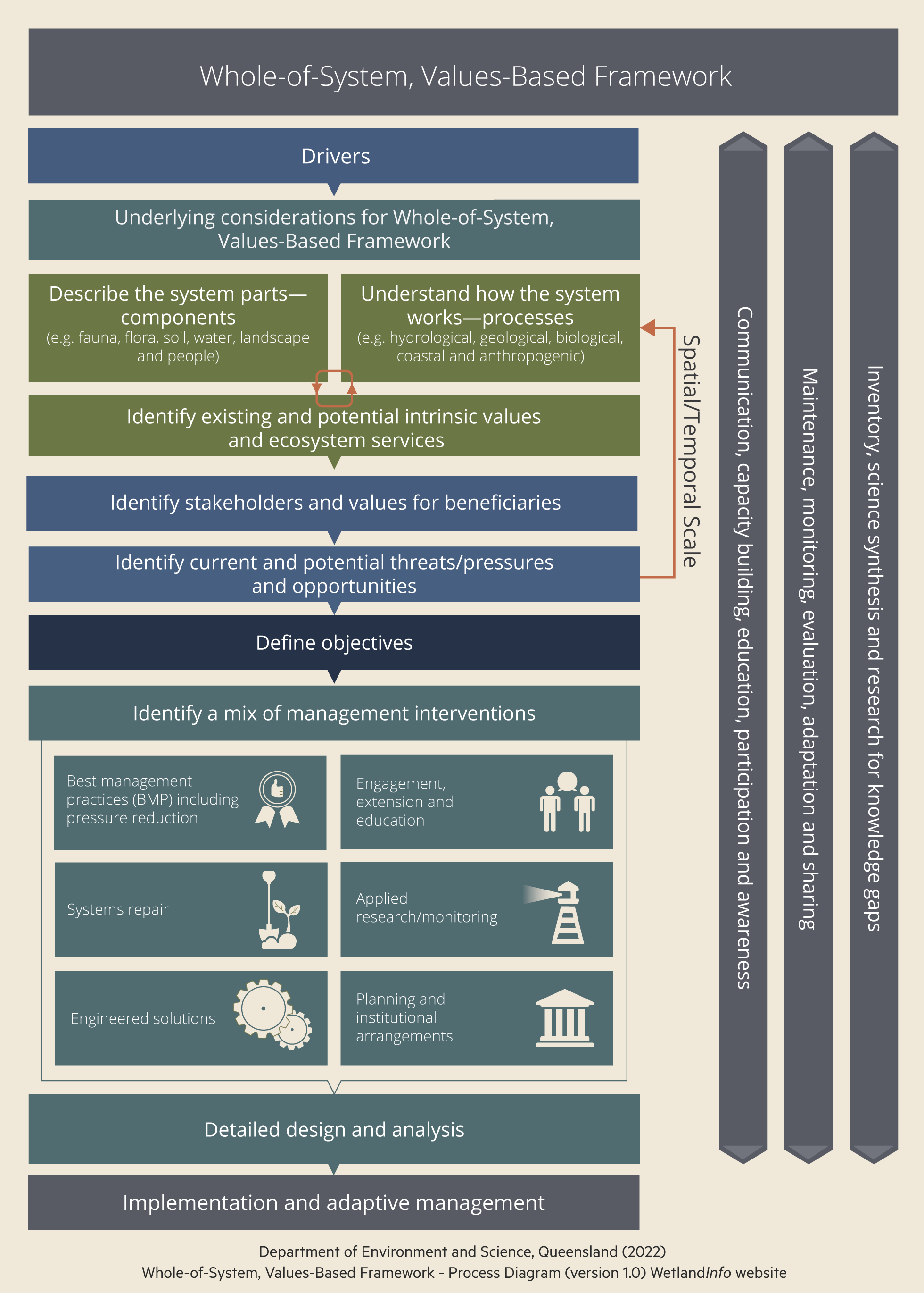 Whole-of-System, Values-Based FrameworkUnderstanding the parts of a system (e.g. the components), how it works (e.g. the processes), how it integrates with the landscape at multiple scales, and the services and values it provides, are critical to developing appropriate management activities. A Whole-of-System, Values-Based Framework factsheet is available.