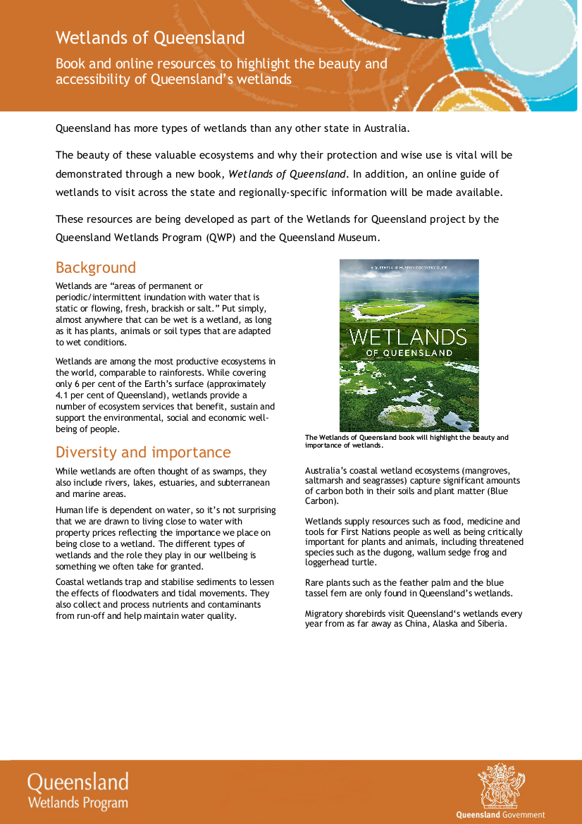 Intertidal and Subtidal Products![]() The Queensland Intertidal and Subtidal Ecosystem Classification scheme (the scheme) provides the understanding and classification of the biological, physical and chemical factors determining the nature and extent of ecosystems that underpin the mapping and ecosystem type descriptions. Four modules are available covering different aspects of the scheme. Module 4: A method for providing baseline mapping of intertidal and subtidal ecosystems in Queensland, applies the framework of Module 1 to mapping. Wetlands of Queensland Factsheet![]() The Wetlands of Queensland book and online information factsheet highlighting the beauty and accessibility of Queensland's Wetlands is now available. UpdatesWetlandMaps and WetlandSummaryNew layers on WetlandMaps: Updated catchment stories and Aquatic Conservation Assessment areas, Roads and tracks, Railway lines, Suburb/Population Centre names, Cadastre and Bores x 2 (Groundwater Database layer and mining bores layer). Updated layers on WetlandMaps and WetlandSummary: Updated catchment stories and Aquatic Conservation Assessment areas. The Assessment Toolbox