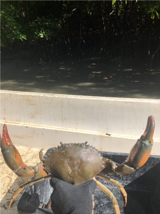 The feature species for February is the giant mud crab, or mangrove crab (Scylla serrata). Worldwide, there are four species of mud crab, two of which are found in Queensland waters – Scylla serrata, the Giant Mud Crab and Scylla olivacea, the Orange Mud Crab, the latter being less common, except for the northern Gulf of Carpentaria and occasionally on the east coast as far south as Townsville. The giant mud crab is an ecologically important species of crab found in mangrove lined rivers, sheltered estuaries and tidal flats. Juvenile mud crabs are found in the mangrove zone and subadult and adults migrate into the intertidal zone to feed at high tide. Their shells can vary in colour, ranging from blue to a deep mottled green and very dark brown. Giant mud crabs can grow up to 300 millimetres in shell width, and weigh up to 2.5 kilograms. Mud crabs have large claws, and their last pair of legs are flattened for swimming. Crabs grow through a series of moults as they reach the size of their current shell. Mud crabs will use their claws for defence and sometimes shed their claws to escape. Starting as zoea (type of larva), mud crabs hatch from eggs and float in the water. The zoea will then moult four times over a period of 12 to 15 days (temperature dependent), becoming a megalopa on the fifth moult, with functioning claws. Soon after the megalopa metamorphoses to becomes a crablet about 3 mm in shell width. Mud crabs moult multiple times through their life to grow (about 16 moults) reaching sexual maturity at 18 to 24 months old. Females can produce up to three egg-masses, with 34 to 59 days between spawning events under aquaculture conditions. The fertilised eggs are released in batches of two to five million. Once hatched, the pelagic larvae are distributed by ocean currents, but eventually must reach nearshore waters to survive and metamorphose into megalopa. There is high larval mortality, hence the large number of eggs produced by mud crabs. Mud crabs forage at night and eat slow moving or stationary animals such as molluscs, smaller crabs and worms. Mud crabs use their large claw to crush and their smaller claw to cut. Their claws are very powerful - mud crabs can crush shells that require up to 40 kilograms of force to break! Additional information