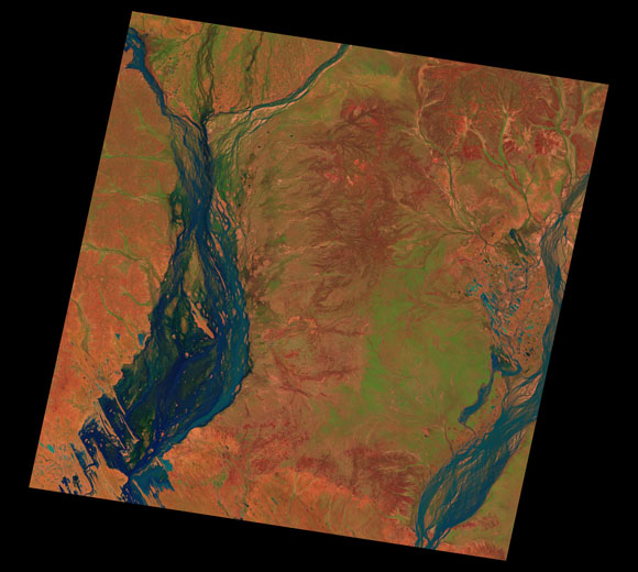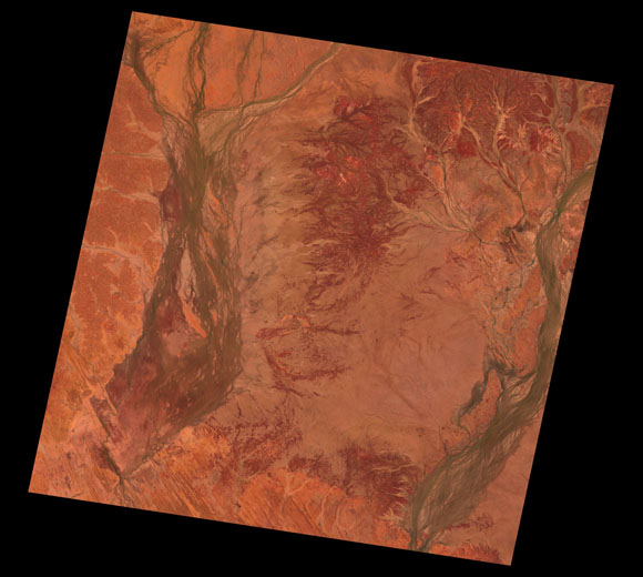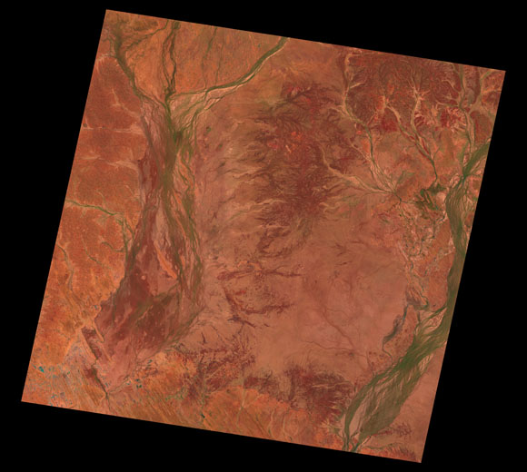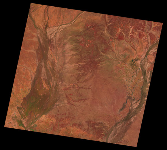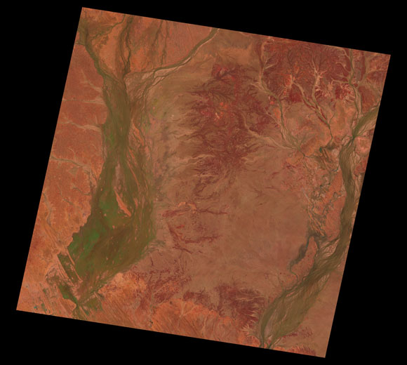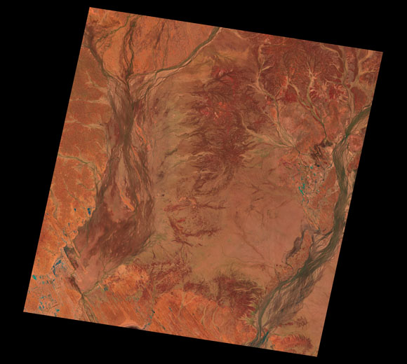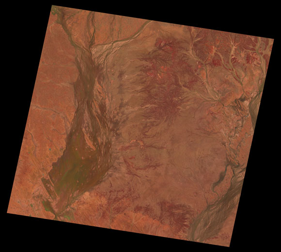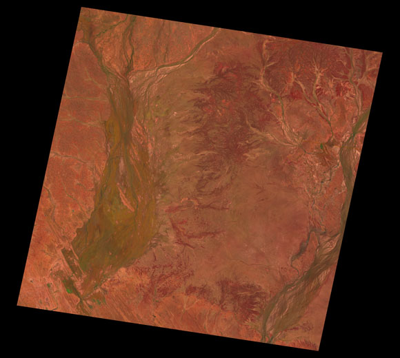 Bedourie Landsat SceneImages are colour-mapped to enhance the contrast of water bodies (Shortwave→Red, Near-infrared→Green, Green→Blue) Copyright Commonwealth of Australia - Geoscience Australia. Imagery post-processed by DETSI. This page should be cited as: Department of Environment, Science and Innovation, Queensland (2013) Bedourie Landsat Scene, WetlandInfo website, accessed 8 May 2025. Available at: https://wetlandinfo.des.qld.gov.au/wetlands/resources/tools/hydro-climate/scene/bedo/ |