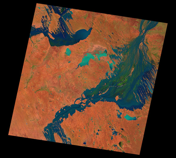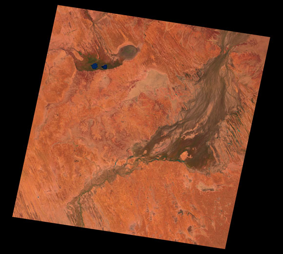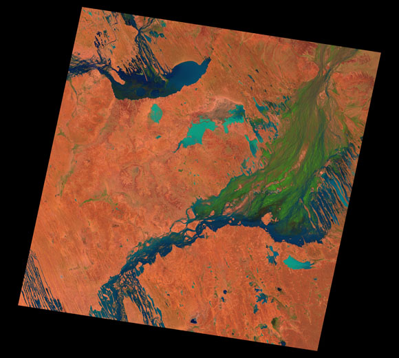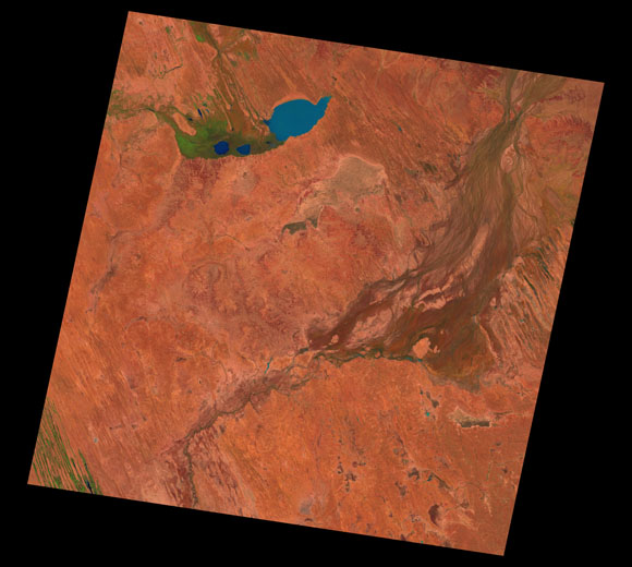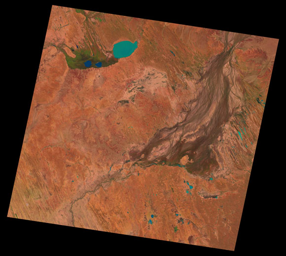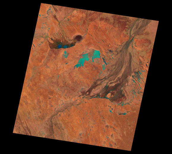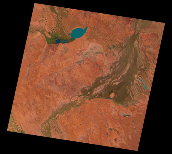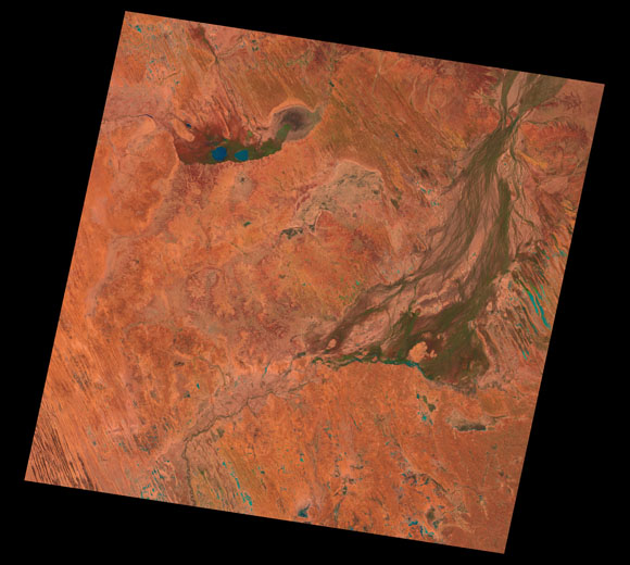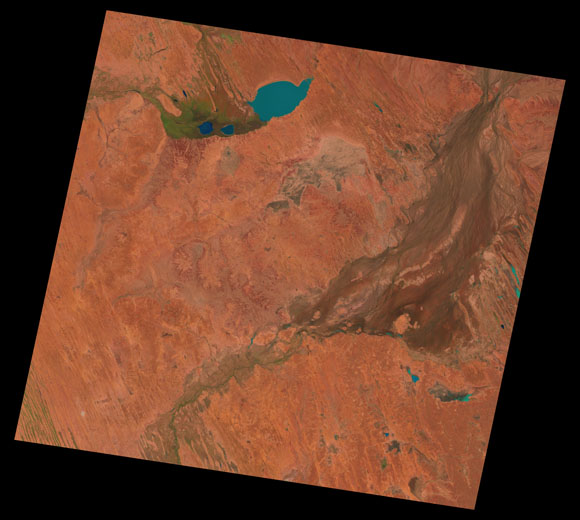 Birdsville Landsat SceneWRS path/row: 98/77-78 Images are colour-mapped to enhance the contrast of water bodies (Shortwave→Red, Near-infrared→Green, Green→Blue) Copyright Commonwealth of Australia - Geoscience Australia. Imagery post-processed by DETSI. This page should be cited as: Department of Environment, Science and Innovation, Queensland (2013) Birdsville Landsat Scene, WetlandInfo website, accessed 8 May 2025. Available at: https://wetlandinfo.des.qld.gov.au/wetlands/resources/tools/hydro-climate/scene/bird/ |