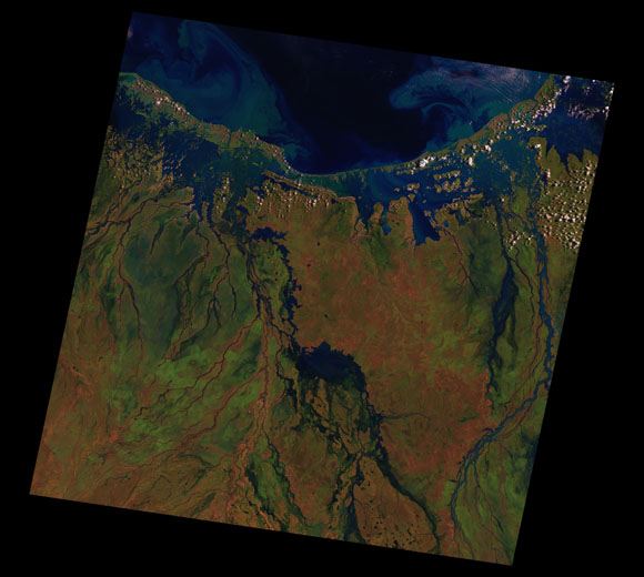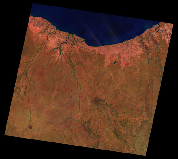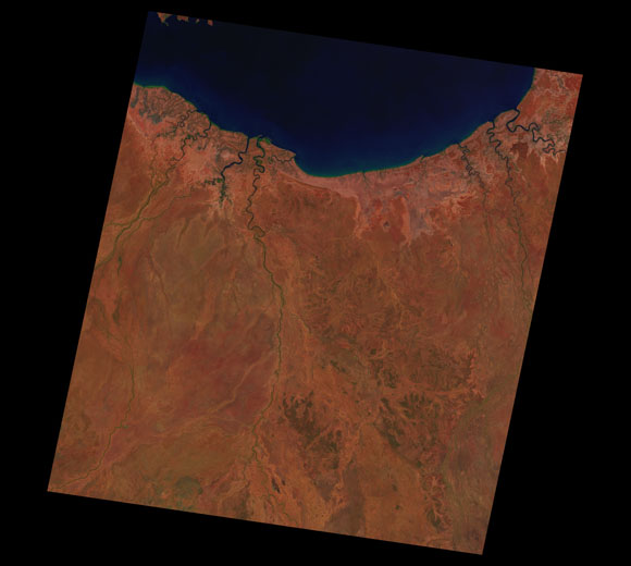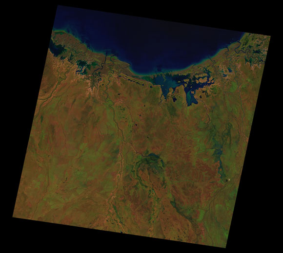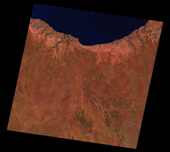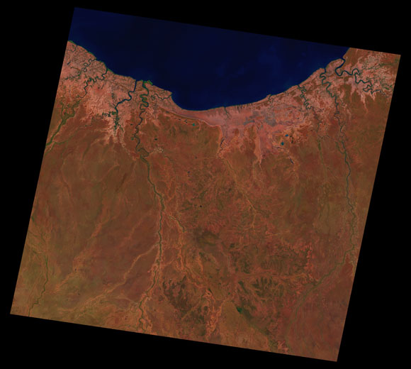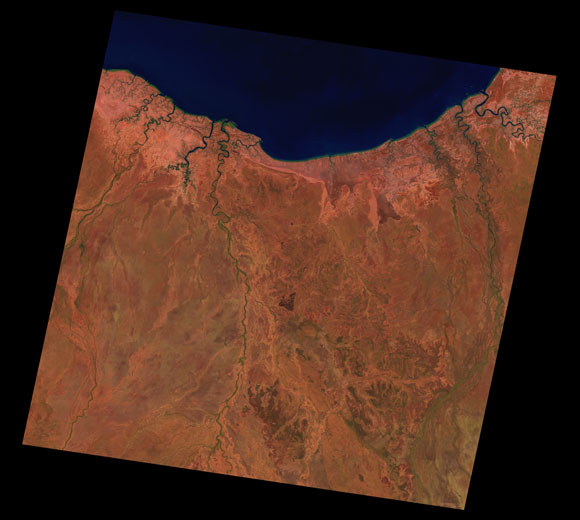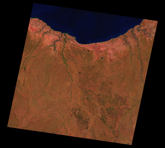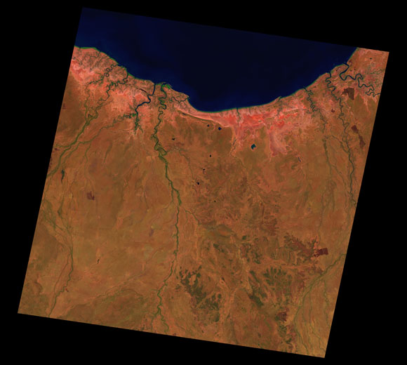Burketown Landsat SceneWRS path/row: 99/72-73 Images are colour-mapped to enhance the contrast of water bodies (Shortwave→Red, Near-infrared→Green, Green→Blue) Copyright Commonwealth of Australia - Geoscience Australia. Imagery post-processed by DETSI. This page should be cited as: Department of Environment, Science and Innovation, Queensland (2013) Burketown Landsat Scene, WetlandInfo website, accessed 8 May 2025. Available at: https://wetlandinfo.des.qld.gov.au/wetlands/resources/tools/hydro-climate/scene/burk/ |