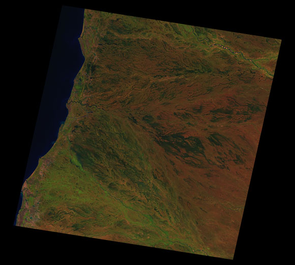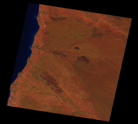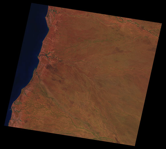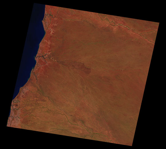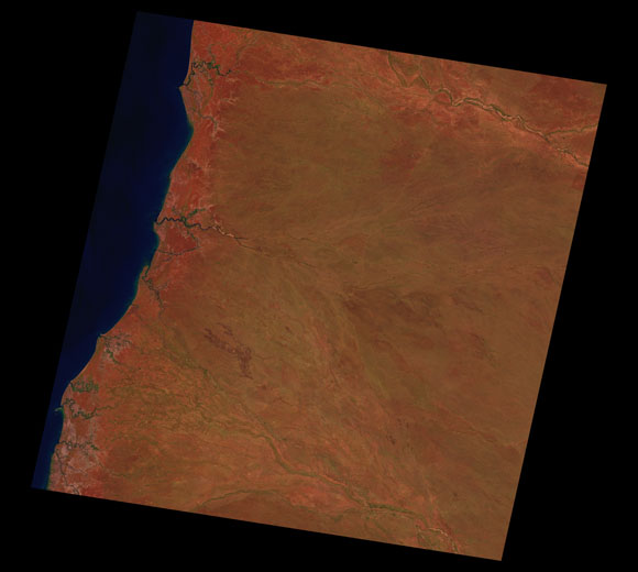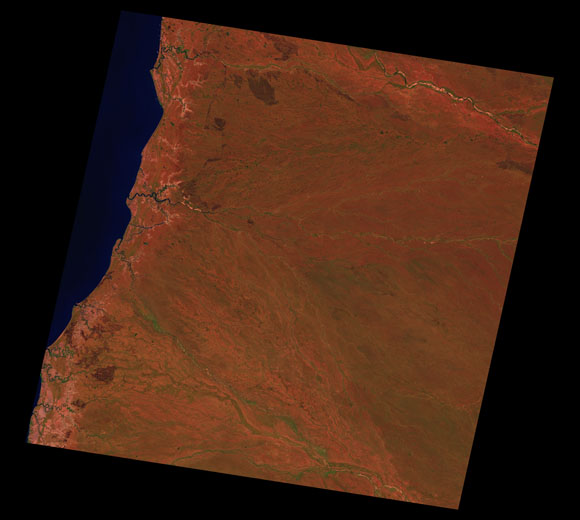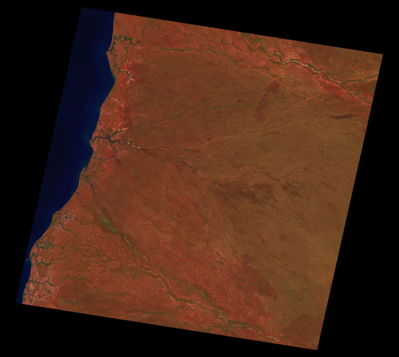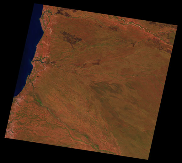 Delta Downs Landsat SceneImages are colour-mapped to enhance the contrast of water bodies (Shortwave→Red, Near-infrared→Green, Green→Blue) Copyright Commonwealth of Australia - Geoscience Australia. Imagery post-processed by DETSI. This page should be cited as: Department of Environment, Science and Innovation, Queensland (2013) Delta Downs Landsat Scene, WetlandInfo website, accessed 8 May 2025. Available at: https://wetlandinfo.des.qld.gov.au/wetlands/resources/tools/hydro-climate/scene/delt/ |