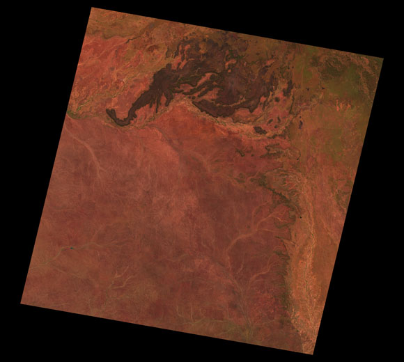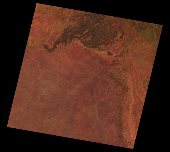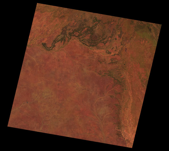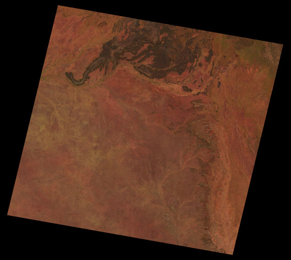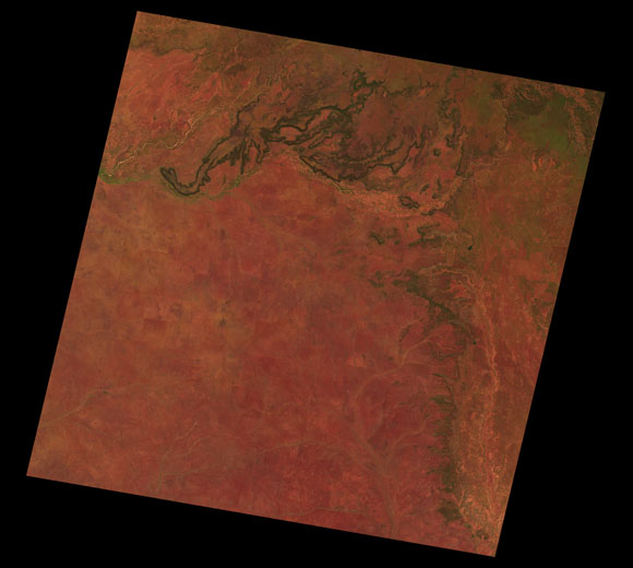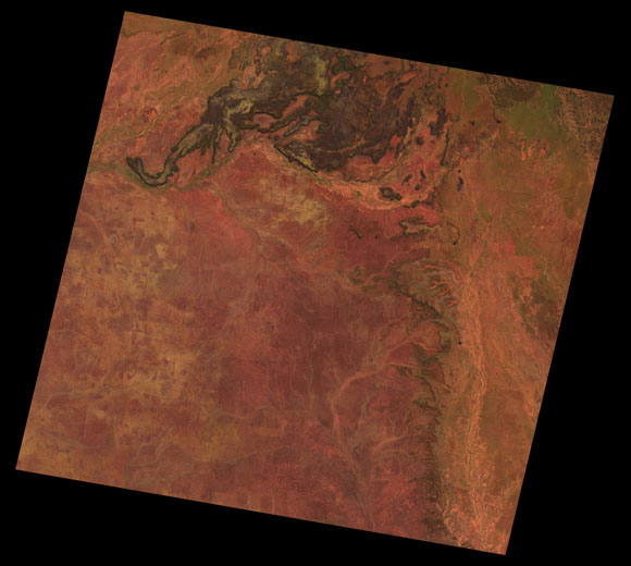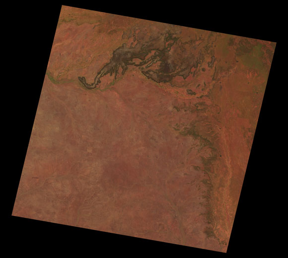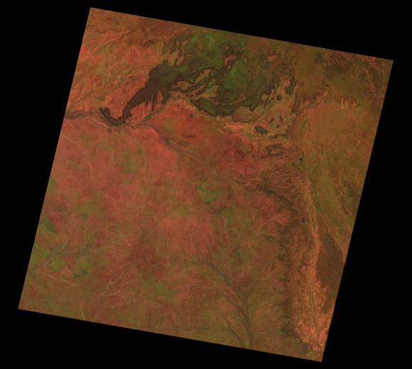 Hughenden Landsat SceneWRS path/row: 96/74-75 Images are colour-mapped to enhance the contrast of water bodies (Shortwave→Red, Near-infrared→Green, Green→Blue) Copyright Commonwealth of Australia - Geoscience Australia. Imagery post-processed by DETSI. This page should be cited as: Department of Environment, Science and Innovation, Queensland (2013) Hughenden Landsat Scene, WetlandInfo website, accessed 8 May 2025. Available at: https://wetlandinfo.des.qld.gov.au/wetlands/resources/tools/hydro-climate/scene/hugh/ |