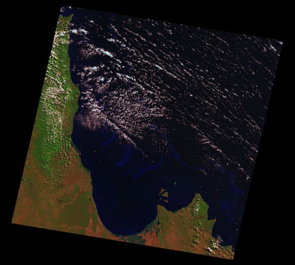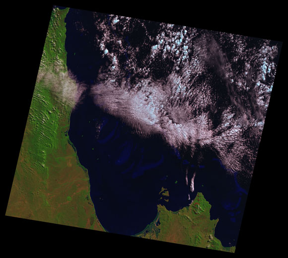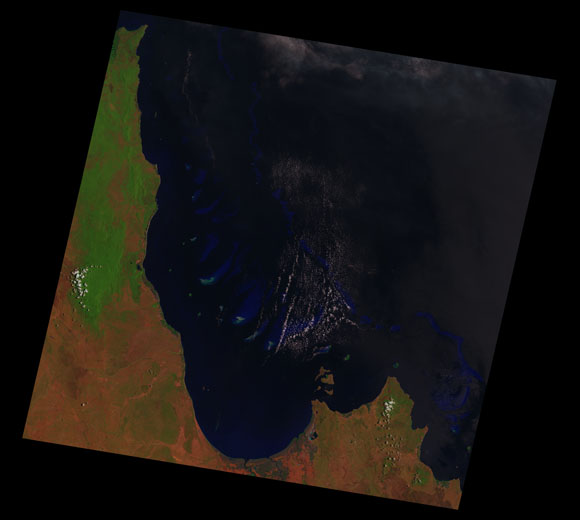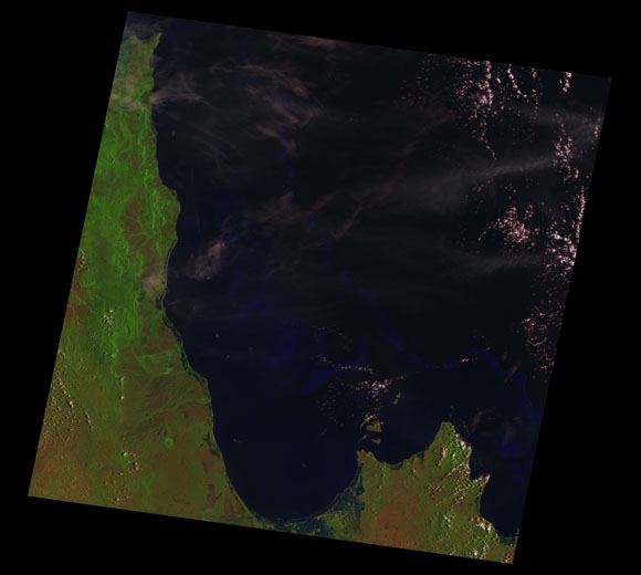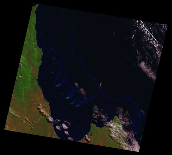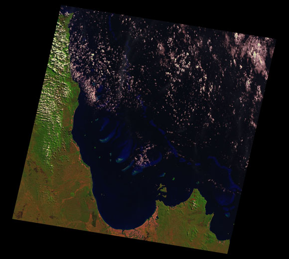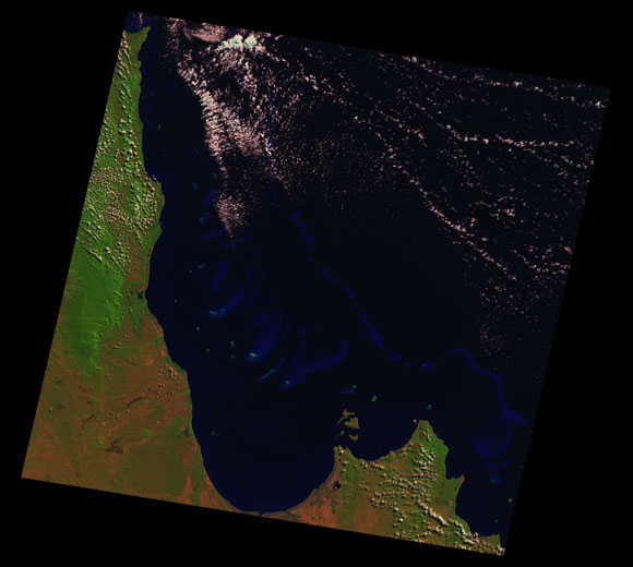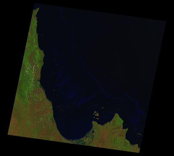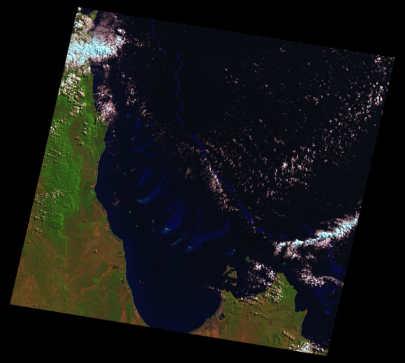 Princess Charlotte Landsat SceneImages are colour-mapped to enhance the contrast of water bodies (Shortwave→Red, Near-infrared→Green, Green→Blue) Copyright Commonwealth of Australia - Geoscience Australia. Imagery post-processed by DETSI. This page should be cited as: Department of Environment, Science and Innovation, Queensland (2013) Princess Charlotte Landsat Scene, WetlandInfo website, accessed 8 May 2025. Available at: https://wetlandinfo.des.qld.gov.au/wetlands/resources/tools/hydro-climate/scene/prin/ |