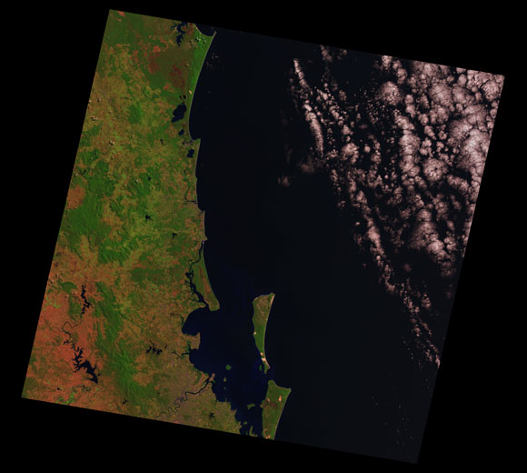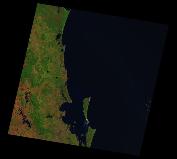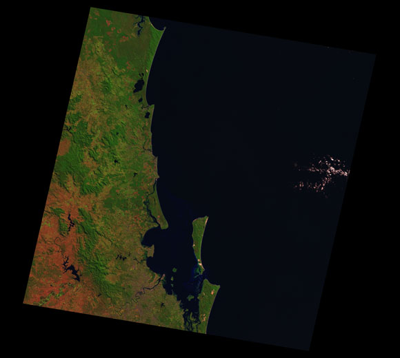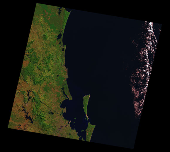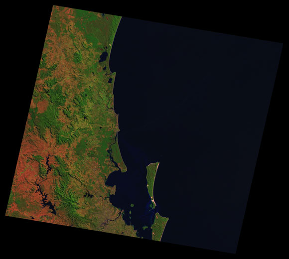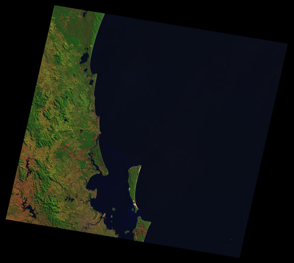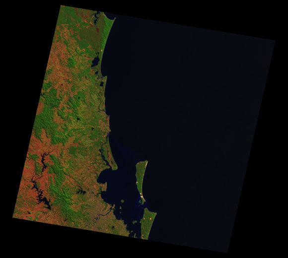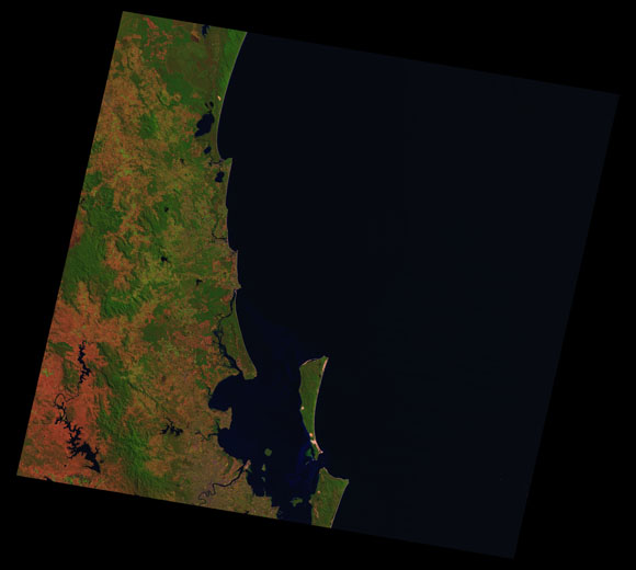 Sunshine Coast Landsat SceneWRS path/row: 89/78-79 Images are colour-mapped to enhance the contrast of water bodies (Shortwave→Red, Near-infrared→Green, Green→Blue) Copyright Commonwealth of Australia - Geoscience Australia. Imagery post-processed by DETSI. This page should be cited as: Department of Environment, Science and Innovation, Queensland (2013) Sunshine Coast Landsat Scene, WetlandInfo website, accessed 8 May 2025. Available at: https://wetlandinfo.des.qld.gov.au/wetlands/resources/tools/hydro-climate/scene/suns/ |