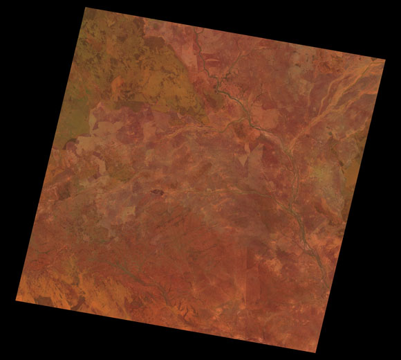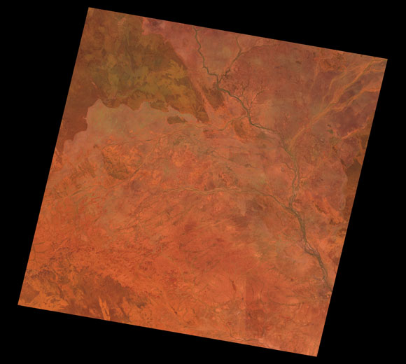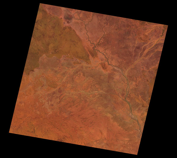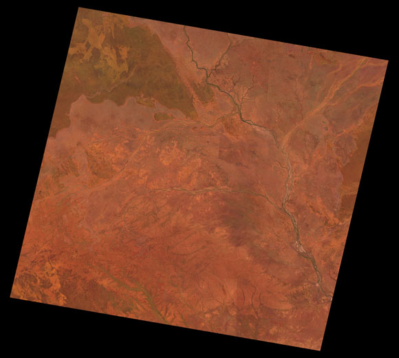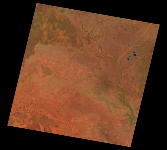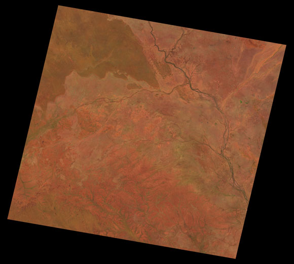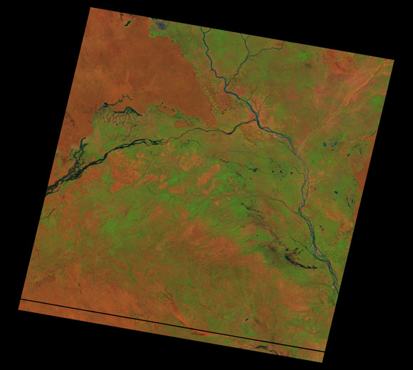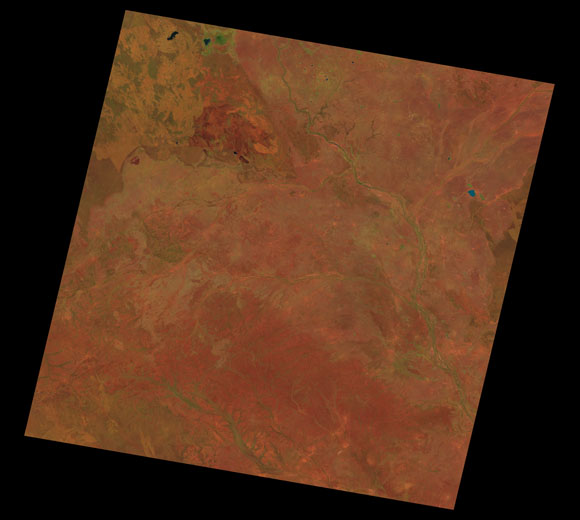 Urandangi Landsat SceneWRS path/row: 100/74-75 Images are colour-mapped to enhance the contrast of water bodies (Shortwave→Red, Near-infrared→Green, Green→Blue) Copyright Commonwealth of Australia - Geoscience Australia. Imagery post-processed by DETSI. This page should be cited as: Department of Environment, Science and Innovation, Queensland (2013) Urandangi Landsat Scene, WetlandInfo website, accessed 8 May 2025. Available at: https://wetlandinfo.des.qld.gov.au/wetlands/resources/tools/hydro-climate/scene/uran/ |