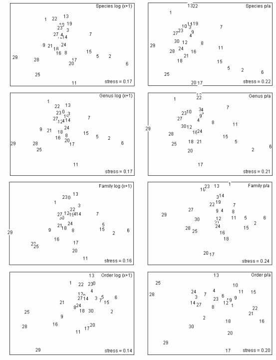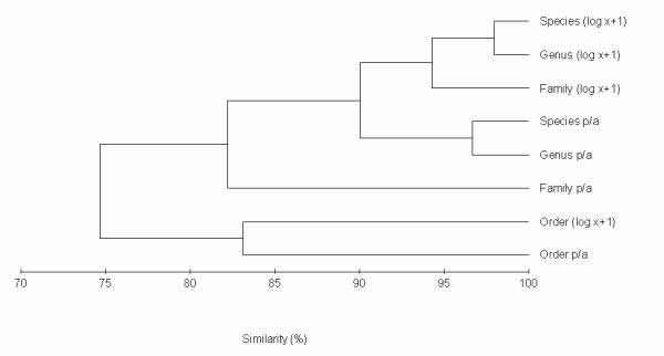 There was also a high similarity between patterns identified from species and order datasets, but ordination revealed some loss of detail in the pattern at order level. Transformation of the abundance data to presence/absence (binary) data resulted in lower overall levels of similarity and loss of pattern resolution with respect to the species abundance data set.